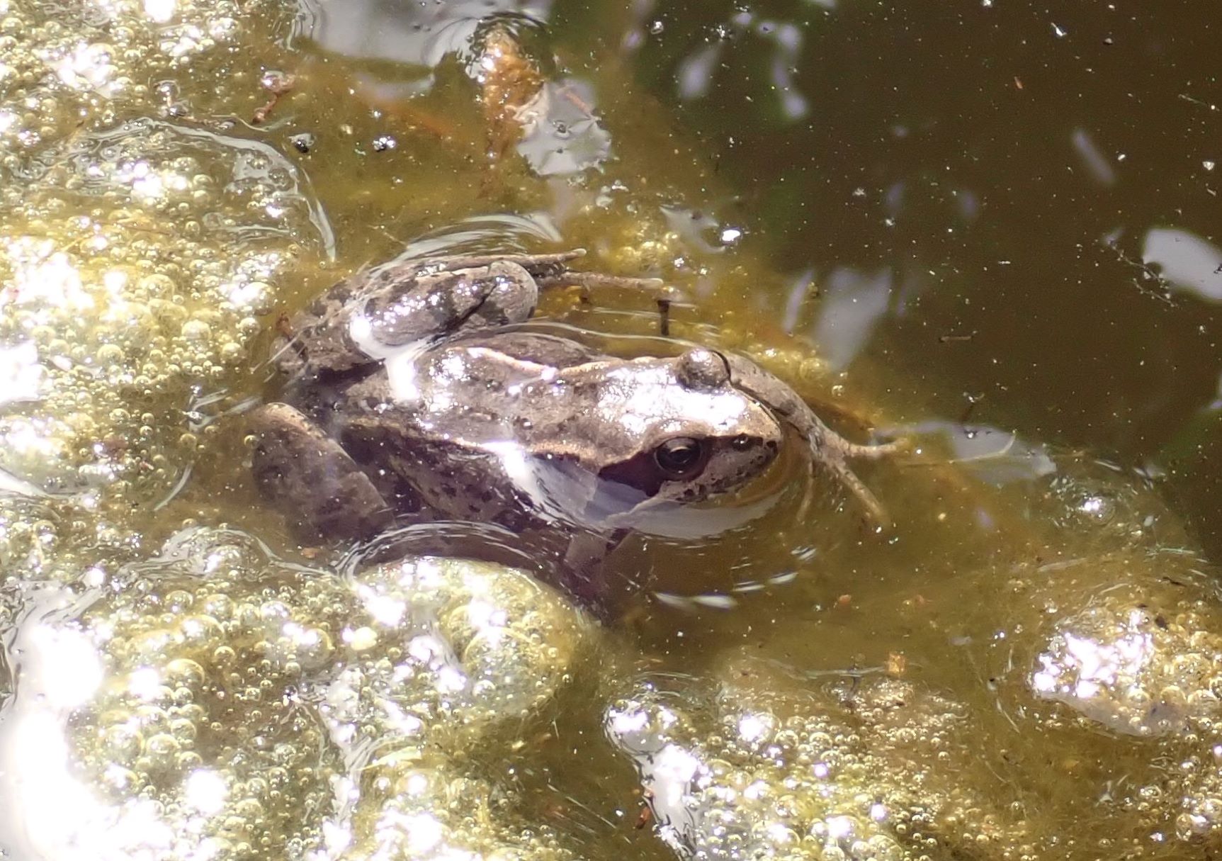 The frog, at least, is not at all worried by the algal bloom which seems to be rather swamping my Water Crowfoot at the moment. Martyn has, of course, checked out the algae and assures me it’s filaments of green Oedogonium covered in an epiphytic diatom Fragilaria gracilis, which likes nutrient-poor conditions, so eutrophication is not the problem here. More likely the recent hot weather has just sped up the algal growth so it’s out of synch with the grazers which normally keep it in check. The solution is just to pull a handful out now and again and throw it on the compost heap – nothing more drastic is needed, despite what some garden experts might suggest. I did put half a dozen Ramshorn snails in the pond in July and hope that, as they grow and feed, the algae will stay in balance.