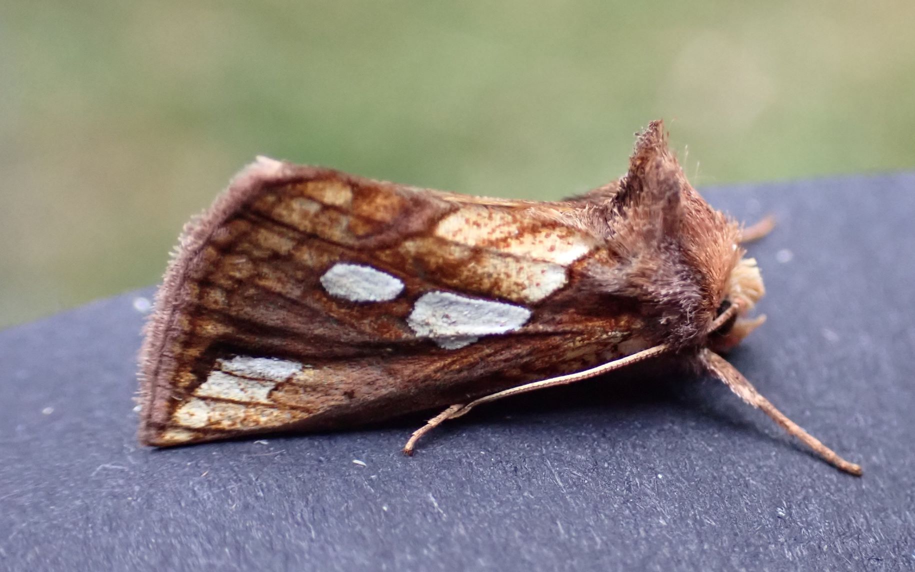 Well I didn’t think it would take so long to get around to writing about my pond again but then I have had my new moth light trap to play with…. It turns out there is at least a possible link between the pond and some of the species I’m finding in the trap. One of the two new moths I found this morning was a Gold Spot, Plusia festucae which, despite a specific name which makes me think of fescue grasses (Festuca spp), has larvae which feed on aquatic marginals such as sedges, Iris and Water Plantain.