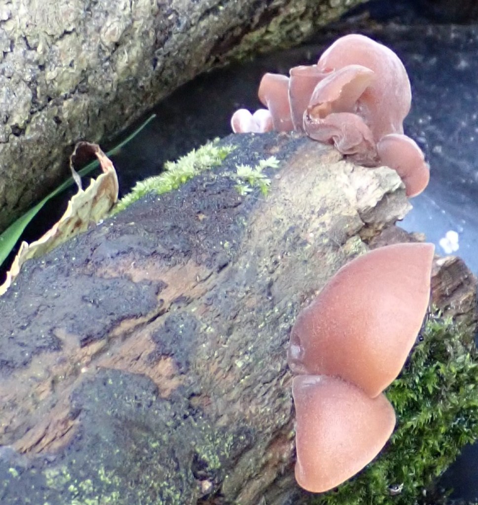 The other part of the new ecosystem developing is on the logs I placed around the pond to cover up the remaining exposed liner and to try and provide more habitat for invertebrates. I was delighted to see fruiting bodies of Jelly ear fungus, Auricularia auricula-judae, appearing on one piece of wood. The plot thickens – or at least the food webs do!