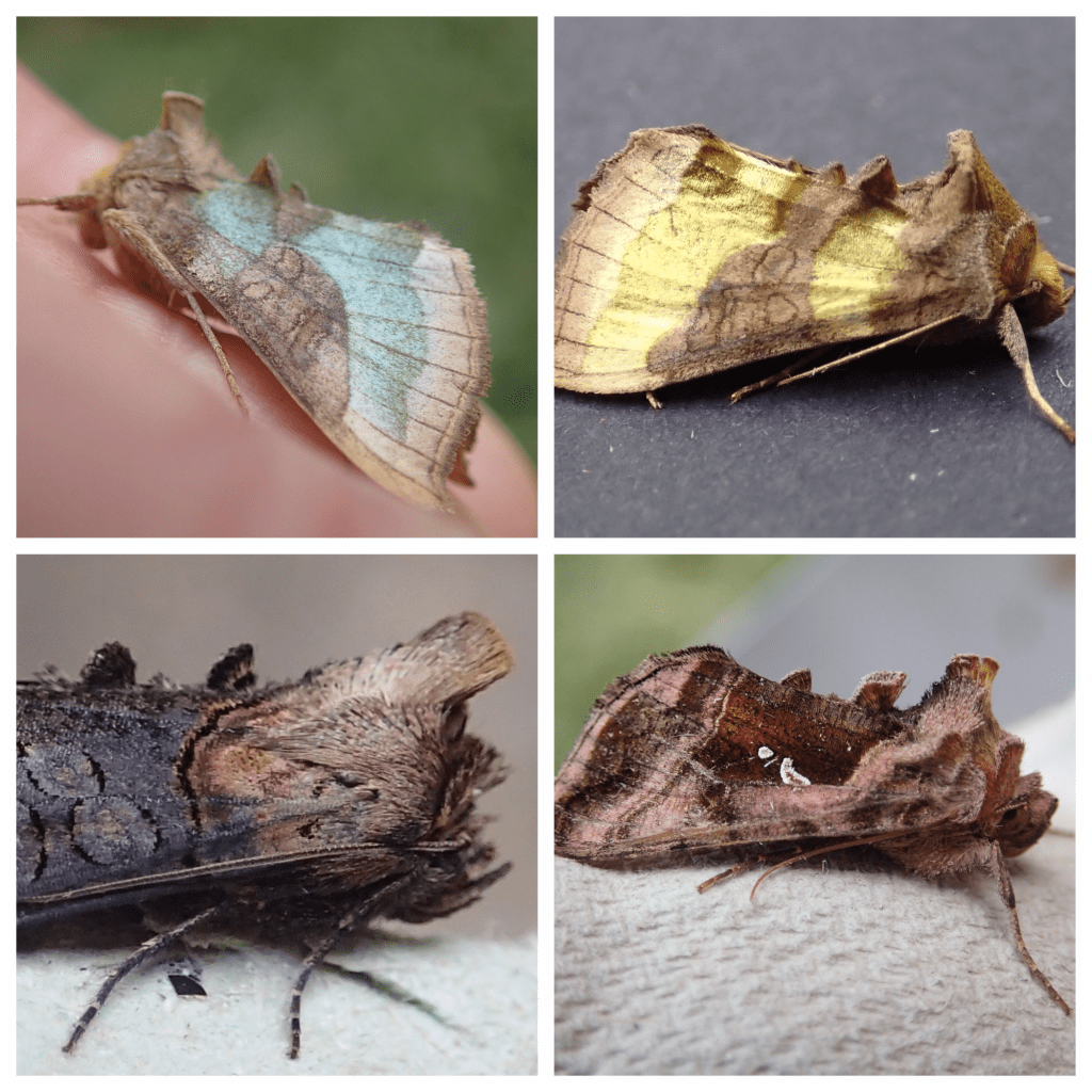 This bonny moth, with its iridescent forewings, is in the Plusinae sub-family of the Noctuidae, like the Plain Golden Y, Burnished Brass and Dark Spectacle moths I was seeing in July. The characteristic resting shape comes from the way the trailing edges of the forewings are brought together over folded hindwings, forming a sort of tent over the body.