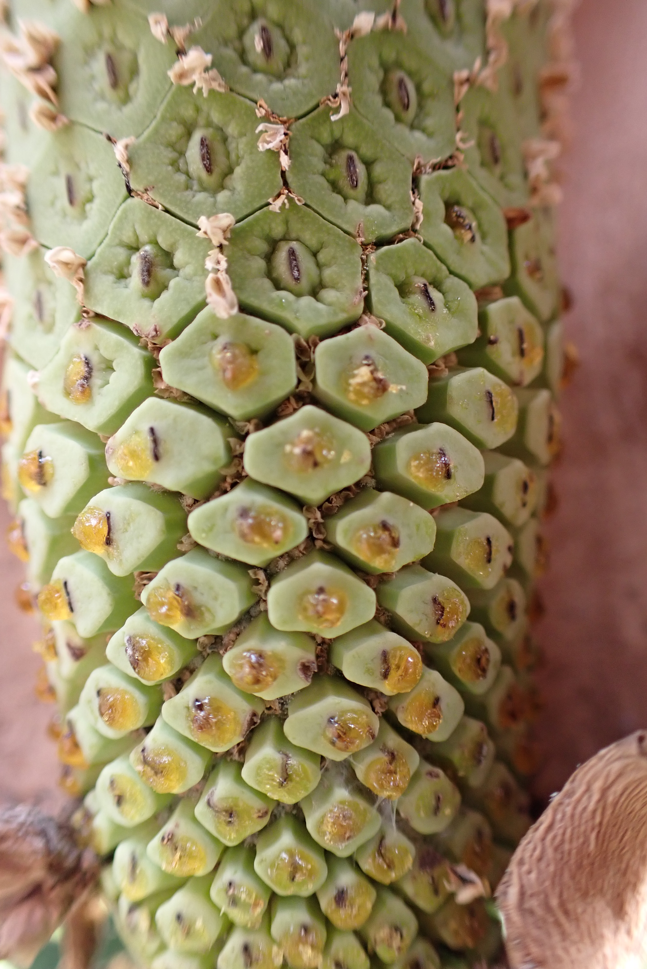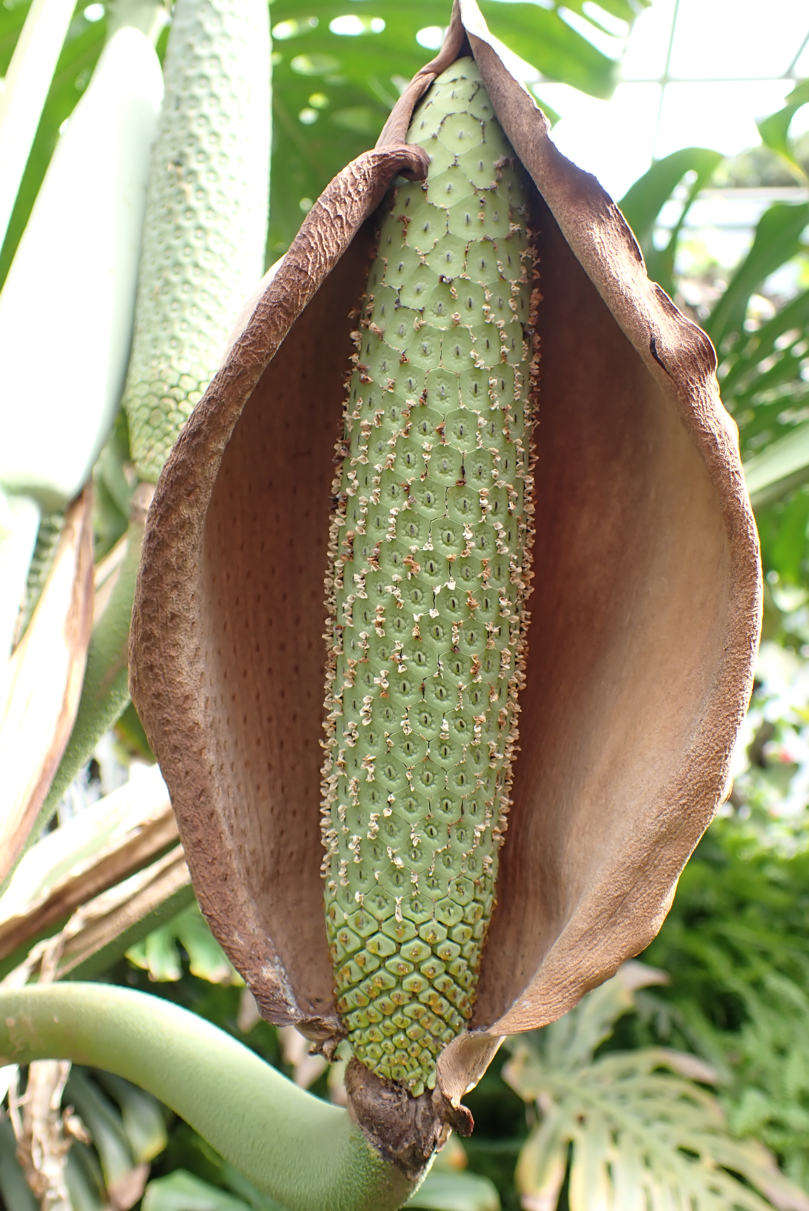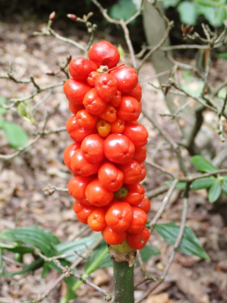 Late, as usual, with my August post! August in the Botanics is the time when fruits of many shapes, sizes and colours really come into their own, both in the glasshouses and in the garden as a whole. The banana tree in the glasshouses has produced a substantial hand of bananas and the Monstera deliciosa, better known as a Swiss Cheese plant after its Emmental-like leaves is also fruiting. I’d not thought about it before but, as its name suggests, the 25 cm long fruits are actually edible, though substantial patience is required; they take more than a year to ripen! I’d also not realised though I should have, from the flower, that Monstera is a member of the Arum family along with Cuckoo-pint (Arum maculatum) which grows abundantly in the wild locally. Like many of its relatives, including Cuckoo-pint, unripe Monstera fruits contain spiky structures made of calcium oxalate which irritate the mouth. In fact Cuckoo-pint fruits are dangerously toxic even when ripe as the crystals irritate the throat and cause serious breathing difficulties.