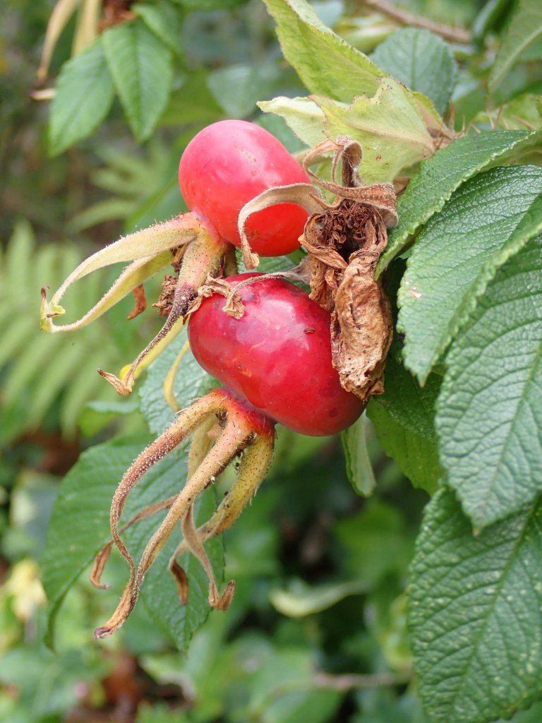 Of course most of the fruits to be found in the Botanic gardens at the moment are much smaller and less obvious but all share the same purpose of protecting the developing seed as it matures and, once that has happened, aiding seed dispersal. Fruits, which are a characteristic of the flowering plants or Angiosperms, are often a reward for partner organisms such as insects, animals or birds which improve the efficiency of seed dispersal. They vary enormously in form from a pod containing peas, to rose hips lined with irritant hairs or ribbed achenes with a thistle-down parachute attached.