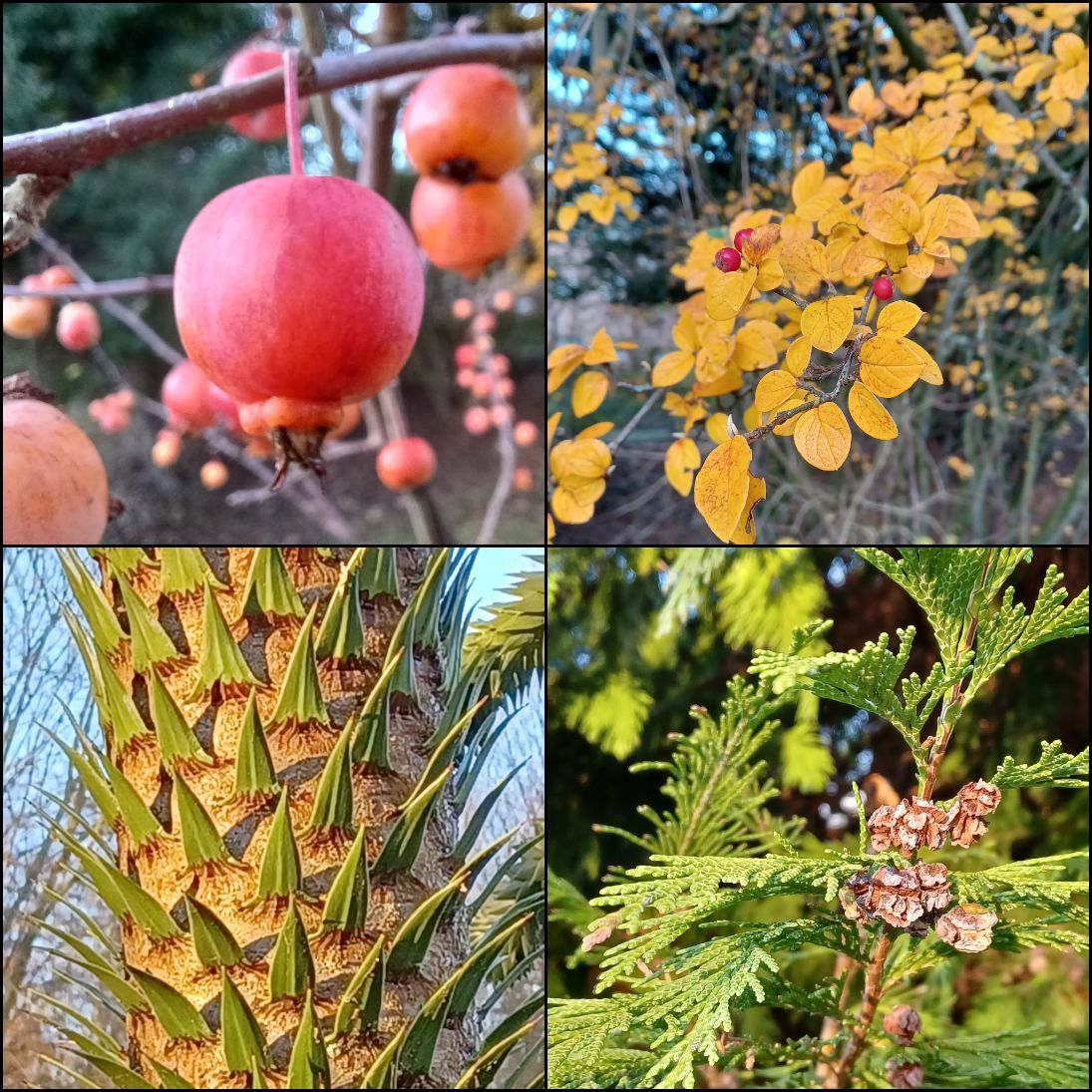 Despite the patina of frost there is still colour to enjoy, from both berries and leaves, as well as the spikey stems of young Monkey puzzle trees growing up to replace the giant killed by Honey fungus and the Lawson cypress cones I first spotted in March.