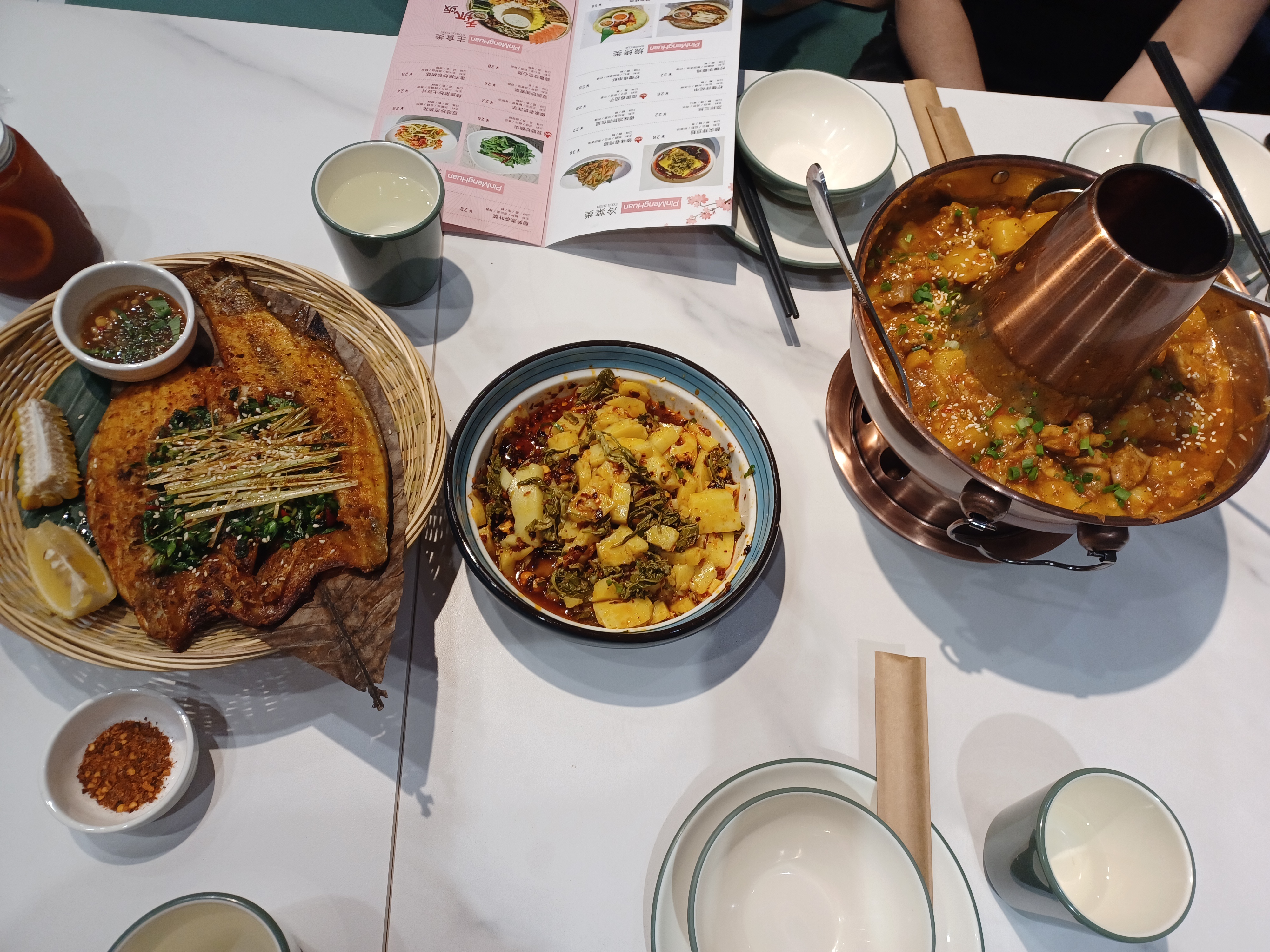 Tuesday followed a similar pattern but with Yunnan food for lunch on the top floor of an upper-end mall, where Kate’s parents had spent the morning in a play area with Casper.  This was one of the meals we’ve both enjoyed most so far, with some very different dishes including water spinach, baked spicy fish, a tasty chicken and potato stew and thin fried potatoes like the Yunnan equivalent of loaded nachos.