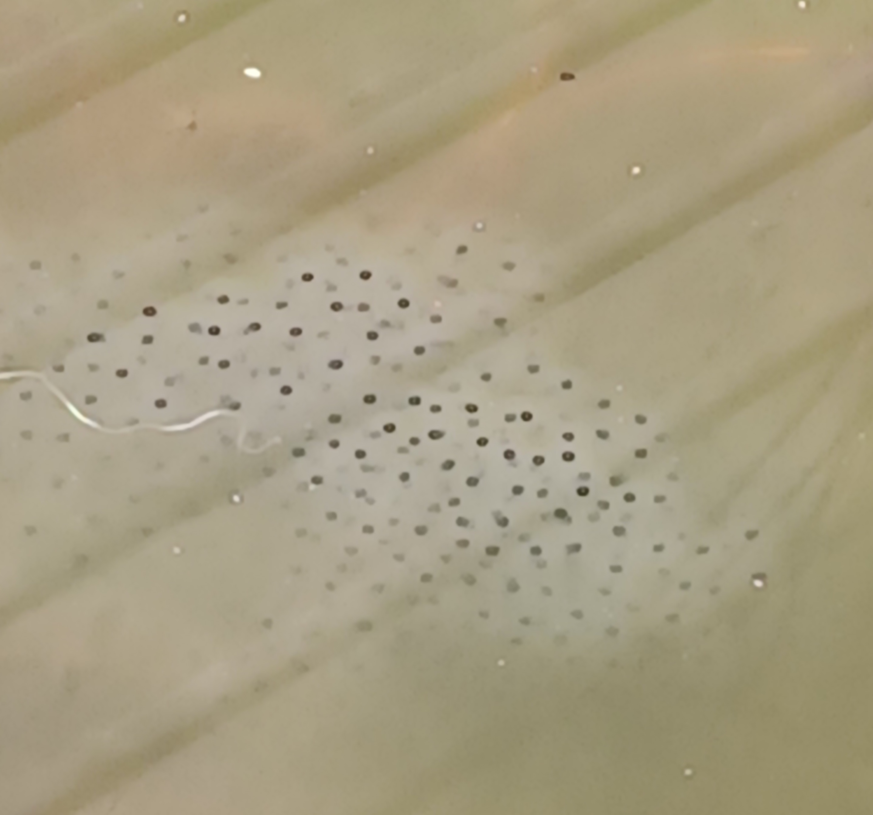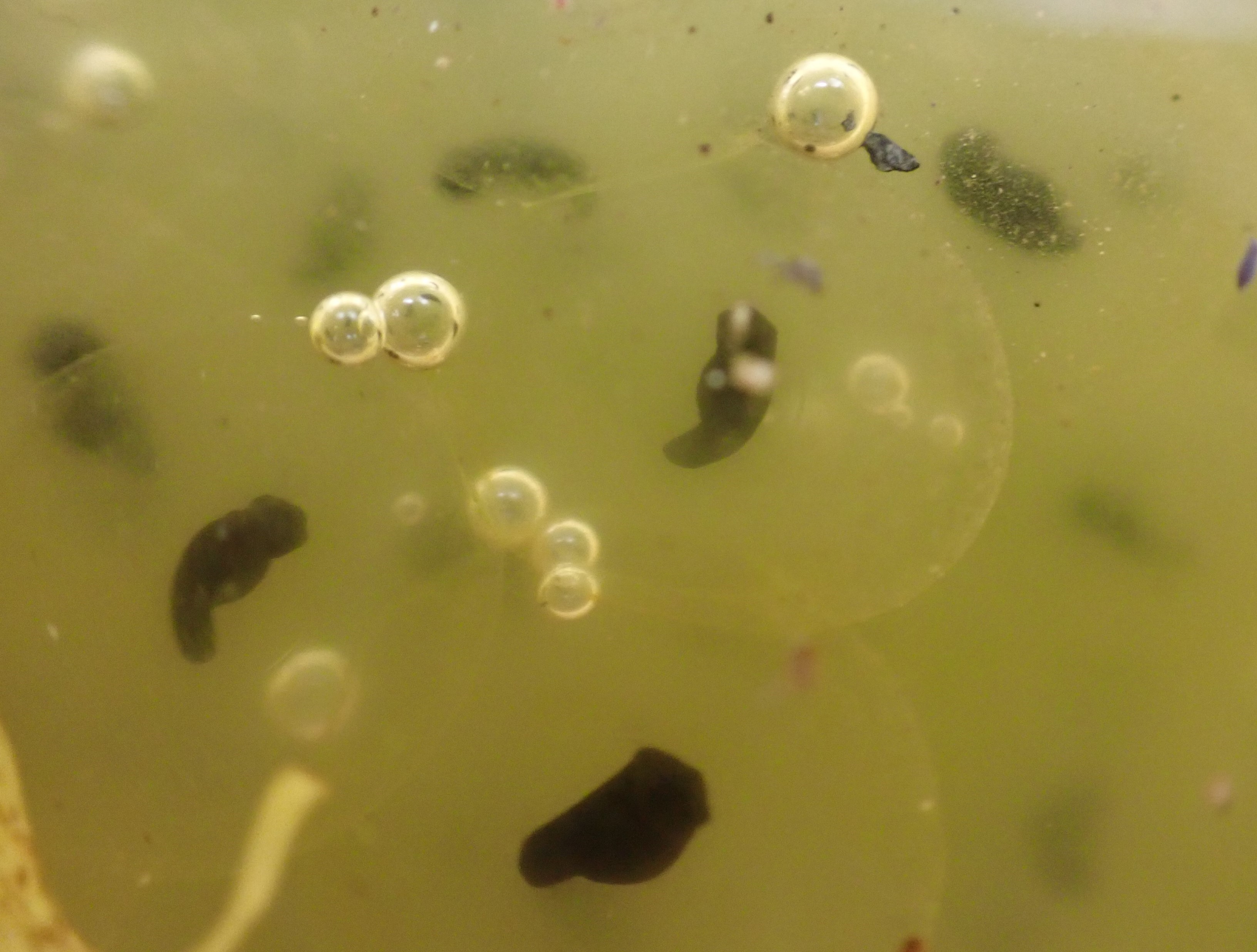 […] hatched into tadpoles now; the jelly-like sacks are empty and tiny tadpoles cluster around them. To start with the tadpoles don’t have mouths and remain dependent on the remains of their egg yolk but, once they develop mouths with rasping teeth, they graze on the film of bacteria and algae […]