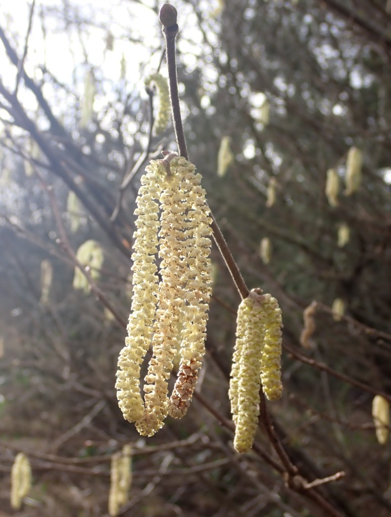 Last but not least, with male Hazel catkins shedding their pollen everywhere, I knew it was time to look for the tiny female flowers, which always remind me of sea anemones. And sure enough, there they were, already dusted with pollen.