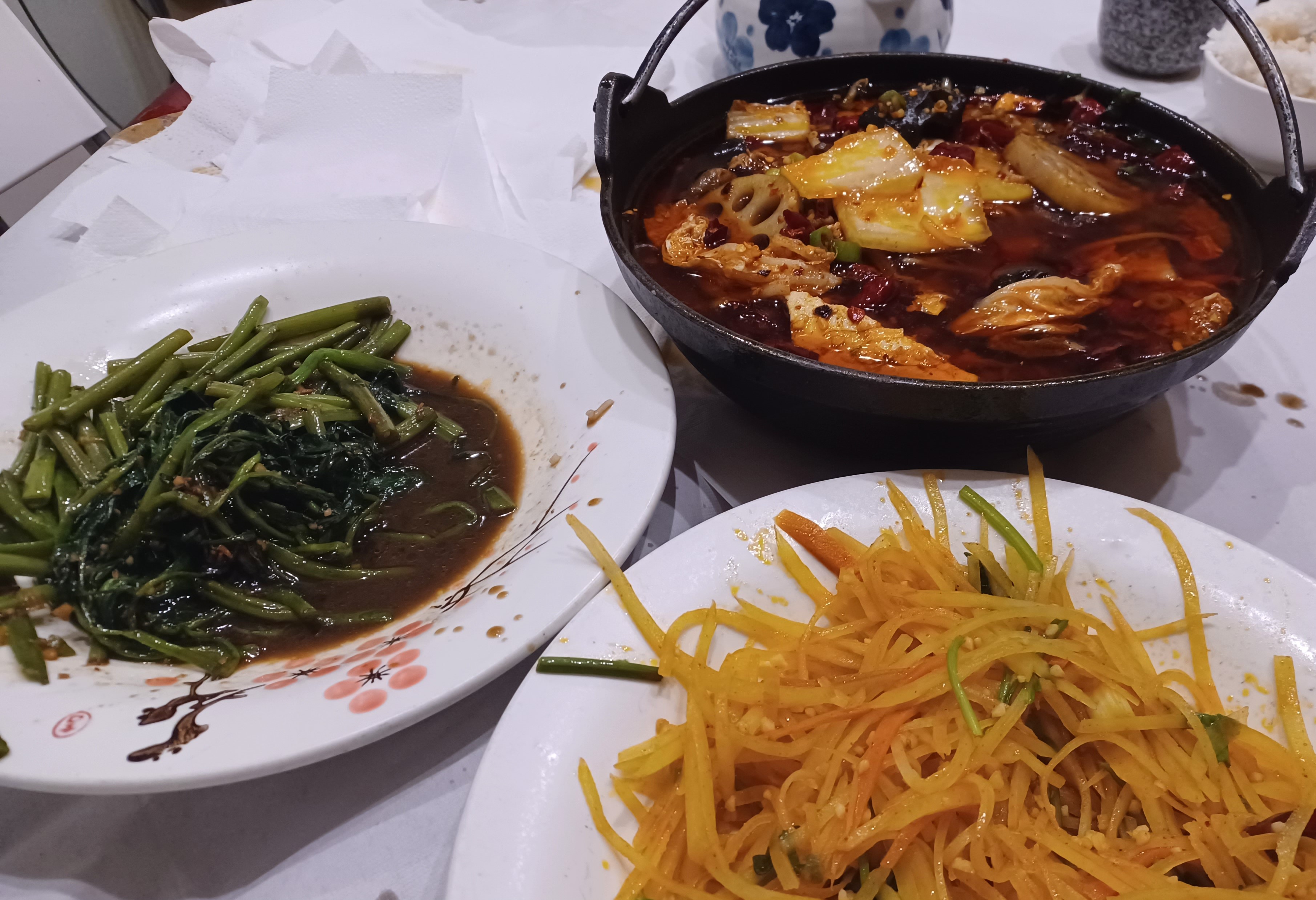 We ate some excellent Sichuan food on Saturday evening at Sense, in Durham, highly recommended by my Chinese students. With Rosie and her cousin currently in China, and Martyn having just finished Fushia Dunlop’s Invitation to a Banquet, this felt like the time to treat ourselves. The Morning glory (aka Water spinach) cooked with shrimp paste and stirfried shredded potatoes with chilli and vinegar were excellent, as was Martyn’s ‘Signature Pot’, with pork, wood-ear mushrooms and tofu. We were glad we’d taken the waiter’s advice not to go for the hot version though…