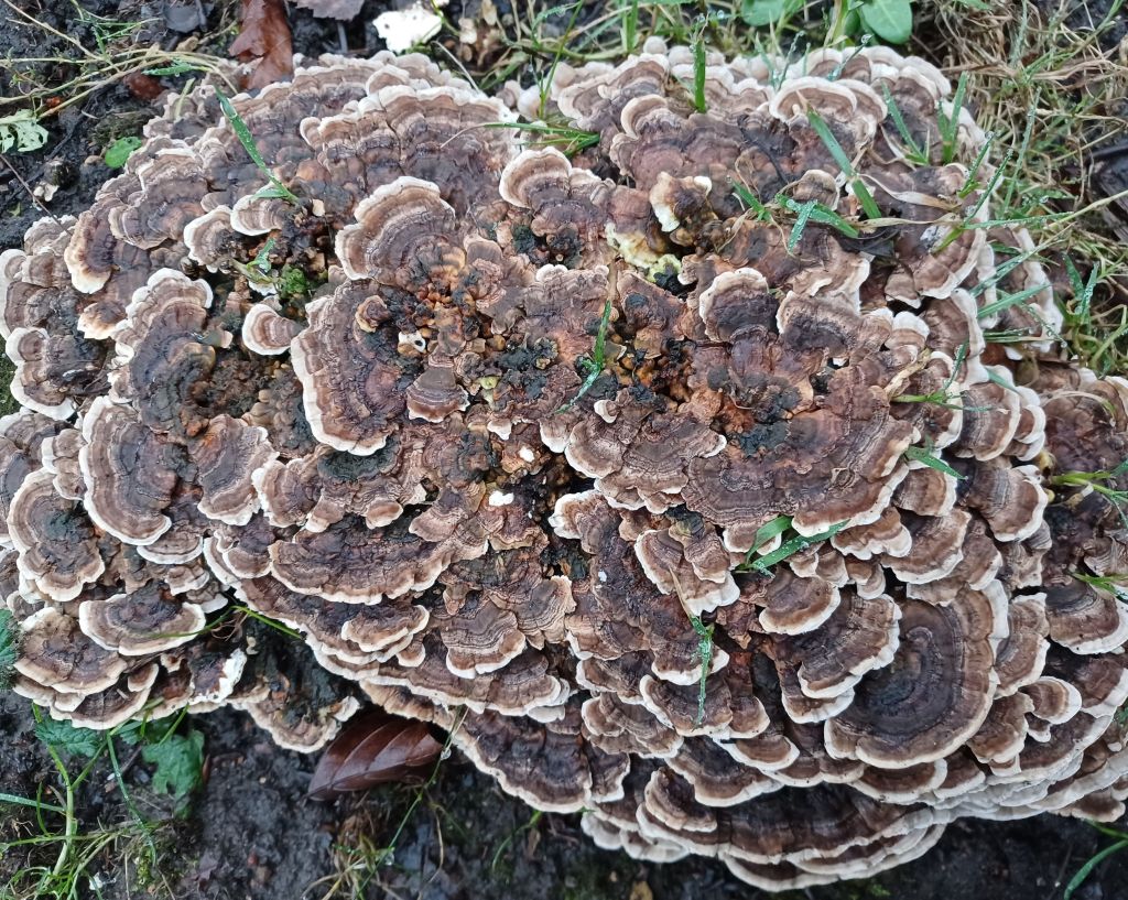This has been a week of ‘interesting’ weather and lots of time in work, so opportunities for nature noticing have had to be grabbed when they’ve arisen. I’ve realised how important the short walk up through High Wood to the department is on the days when I do little more than cycle to work. The signs of spring are there in fresh green leaves bursting from their buds in a few hawthorn and elder trees, which I guess is why I’m also seeing hedgerows being slashed back everywhere by tractor-mounted trimmers. Hedges need to be trimmed when trees are dormant for minimum stress to the plant and it’s also important not to leave it until birds have started to nest, but I do wish farmers were encouraged (i.e. funded) to be a little less brutal in their slashing. Surprisingly, the wood-rotting Turkey Tail fungus, Trametes versicolor, seemed to be growing on bare ground beneath this particular new hedge but on closer inspection turned out to be breaking down the stumps of a previous tree on the site.