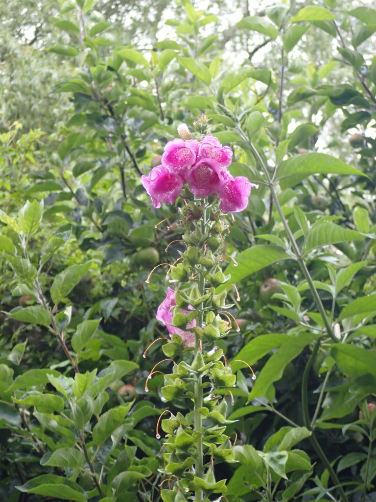 In the garden this week I’ve been admiring the profusely-flowering Meadow Crane’s-bill plants I grew from seed and watching rather soggy bees nectaring on a Foxglove which is way taller than me!