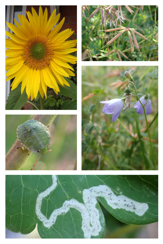 In the garden another bonus from my bird feeder has been enjoying the sunshine – it’s probably the largest sunflower I’ve ever grown, if I can claim credit for growing something I didn’t plant! There are now Harebells flowering in the front ‘lawn’, to my delight and the seed pods of the Bird’s-foot Trefoil there are looking very much like hen’s feet now. The Common Green Shieldbug on the pods was a bonus feature!