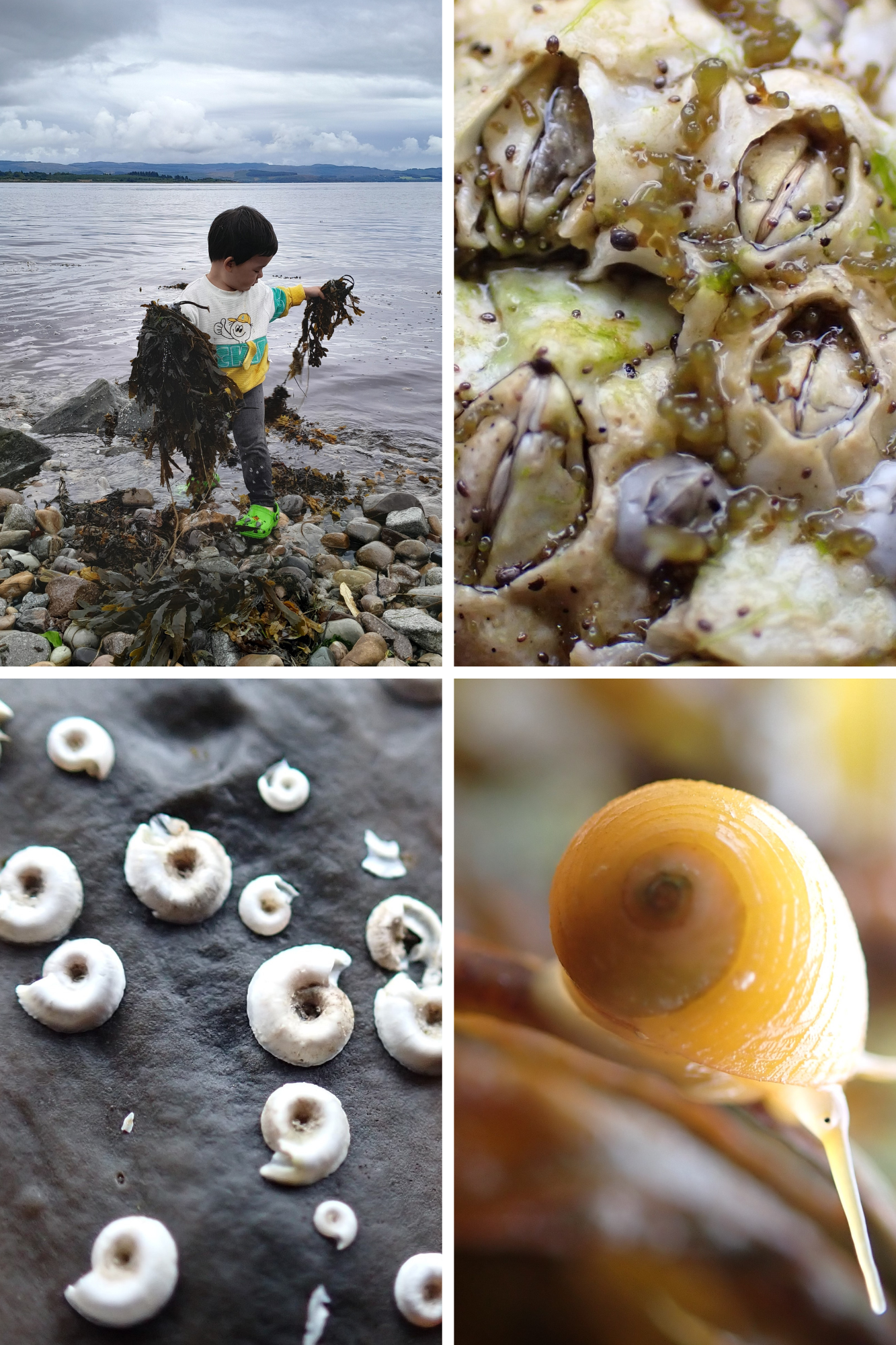 Casper enjoyed the empty beaches in the gaps between showers, and proved quite adept at finding sea anemones ‘hiding’ in crevasses and tiny orange snails on the wrack. We found a crab no bigger than my little fingernail but he was still very wary of its pincers.