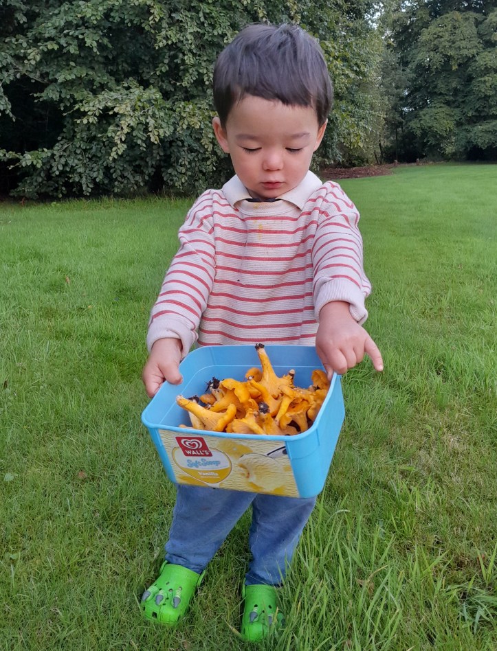 Another advantage of the wet week was the emergence of many, many mushrooms in the woodland and grassland around the estate and Casper turned out to be a dab hand at spotting these. We found waxcaps in the grass and Chicken Lips in the woods and, most excitingly, a huge number of Chantarelle musrooms growing under mature Beach trees around the estate.