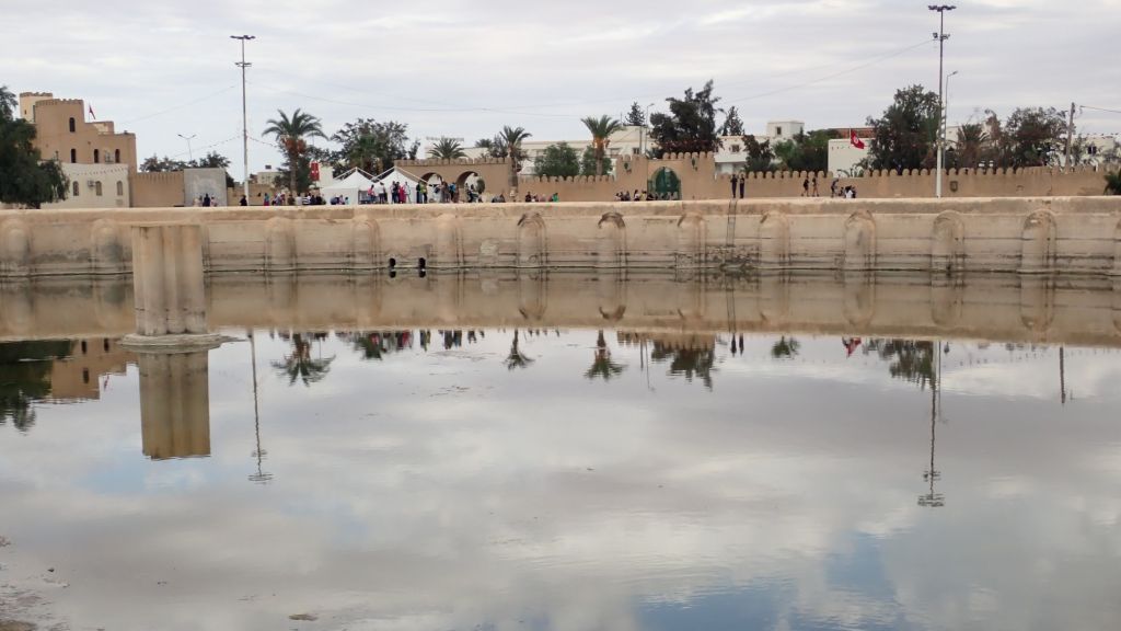On Saturday afternoon we walked out past the mosque to the Aghlabid basins, cisterns built around the same time as the Aghlabids rebuilt the mosque, to hold water brought into the city by aqueduct from the foothills of the Atlas mountains, more than 30 km away – quite a feat of engineering. The main pond is 128 m across and 5 m deep so can store vast quantities of water but I wouldn’t fancy drinking or even washing in the water they hold today. A lack of water at this time of year is one problem but there is also a chronic problem with litter, particularly plastic, here; Africa News cite a figure of 6.8 kilos of plastic discarded daily per kilometre of Tunisia’s 1300 km coastline and don’t mention the plastic bottles and bags we also see blowing around away from the coast. An informal network of barbechas are responsible for some recycling but a lack of garbage trucks and money to pay for services limits what they can do.