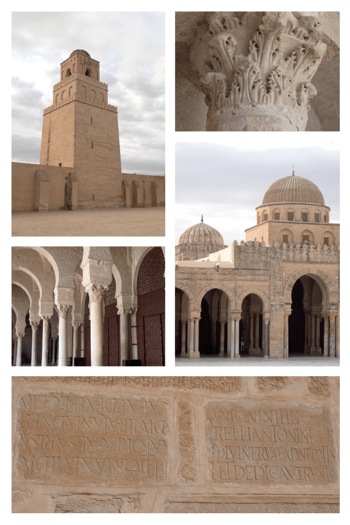 Of course we visited the Great Mosque built, in this austere incarnation, by the Aghlabid dynasty in the 9th Century. The original, built by the founder of Kairouan general Uqba ibn Nafi in 670 AD, was destroyed only 20 or so years later by Berbers. Non-Muslims are welcome in the main courtyard and the beautifully carved doors into the prayer hall are left open so you can peek in. Just like those who lived along the route of Hadrian’s wall, in NE England, people here shamelessly recycled stone from earlier Roman buildings, sometimes more cleverly than others, if you look at the bottom blocks of stone in the picture!