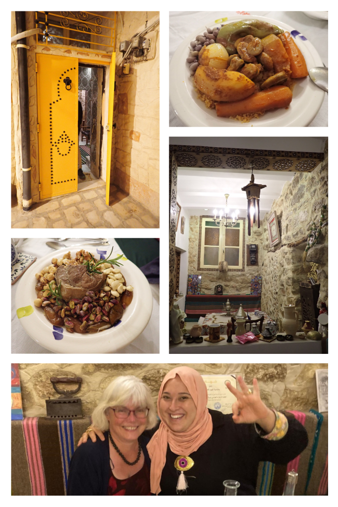The culinary and cultural highlight of our time in El Kef was undoubtedly a meal at the tiny restaurant which forms the bottom floor of Chef Fatma’s house. She is open for reservations only, and these need to be made a couple of days in advance.  We started with a traditional Berber soup (Shorba), Mechouia salad and Tabouna bread. I then had couscous with braised vegetables, while Martyn had the more traditional Borzgane – couscous with lamb served with dates and a variety of nuts.  Both were delicious, as were the homemade lemonade and pastries which followed, but the meal was really made by Fatma’s infectious love of her traditional food heritage and her wish to share it with others.  A lovely evening.