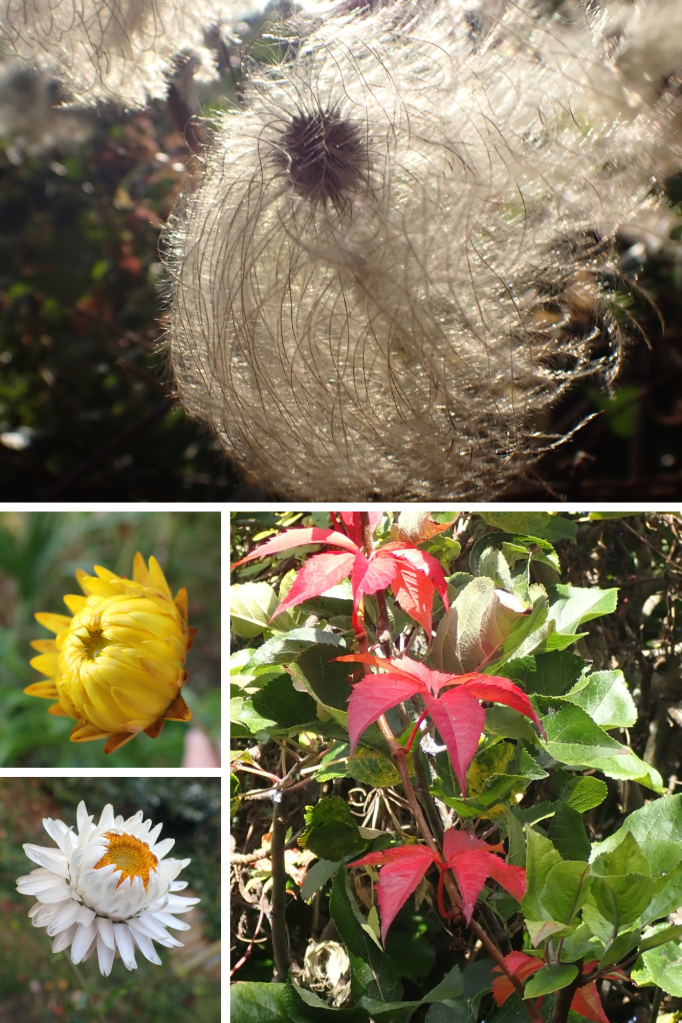 In my garden the Straw flowers and Michaelmas daisies are still going strong and the Virginia Creeper which rampages through our apple tree is finally earning its keep! The silky seed heads of Clematis tangutica look like candy floss in the sun.