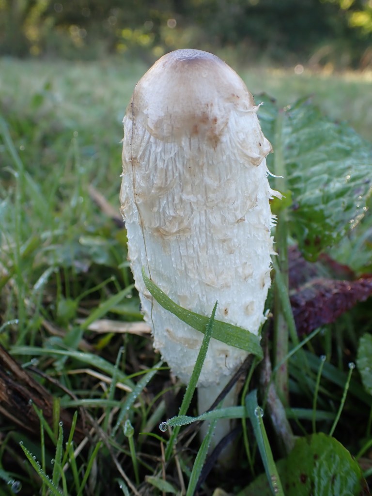 The black mess left when the mushrooms deliquesce (turn to mush) used to be used to make ink, hence the common name. Ink Caps are unusually short lived, even for mushrooms, breaking down within about 24 hours of appearing using enzymes they produce themselves, as they release their spores. As the mushrooms deliquesce, tightly-packed gills underneath the cap separate and curl back allowing the tiny spores to float into the air. The spores are well nourished because, as the fruiting bodies deliquesce, chitinase enzymes release sugary break-down products from the fungal cell walls and transport these into the spores. This gives the spores the best possible chance of germinating successfully.