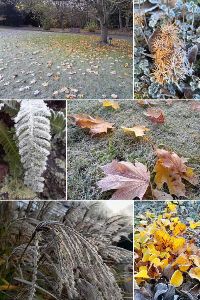 Later in the month the Botanic Gardens looked very different, after a few hard frosts. But I was intrigued to notice that, even after a hard frost, the ground beneath the leafless trees was green and frost-free – as if the tree was protecting it somehow. A little digging (metaphorical) revealed that this is indeed the case. When the air temperature drops at night, water vapour from the air condenses out onto objects close to the ground. For most of the year, this is what we call dew but, if the temperature is low enough, the water freezes and forms ices crystals (frost). Trees, like every living organism, emit a little heat and some of this is directed towards the ground rather than lost into the sky so the ground under the tree stays a little warmer that elsewhere, keeping it frost free at least until the temperature drops further below zero.
