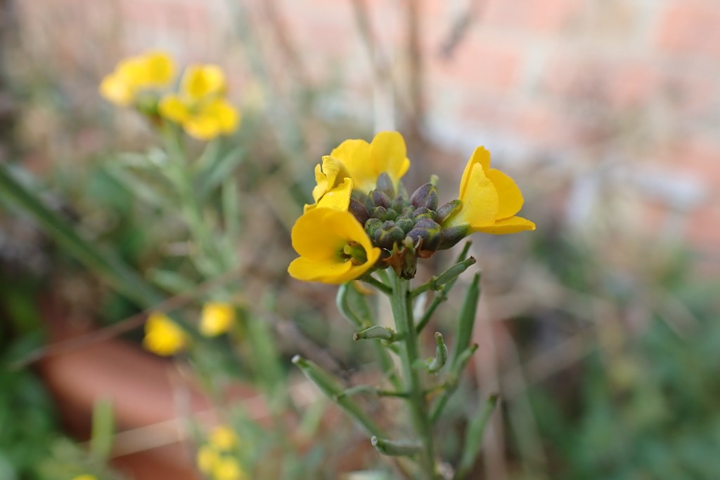 My free time last week was largely spent with Harry at his new flat, painting madly to get it looking more like home, so there was no time for the allotment. With two bedrooms and the large, south-facing living room now mostly finished, I think it’s mission accomplished! He’s just ten minutes walk from the sea front at South Shields so on Thursday we took our sandwiches down to eat overlooking the beach. On Saturday, with Storm Darragh in full swing, that wouldn’t have been much fun! We’ve had Harry’s cat staying with us while he has been moving and settling in and she’s gradually become braver about venturing into the garden and turns out to be particularly adept at darting out the door as I am in the process of leaving and then sheltering in the most in accessible place. The upside of that is that, while trying to bribe her back inside with cat treats, I spotted Wallflowers, Japanese quince and snapdragons in flower, in a sheltered spot at the front of the house.