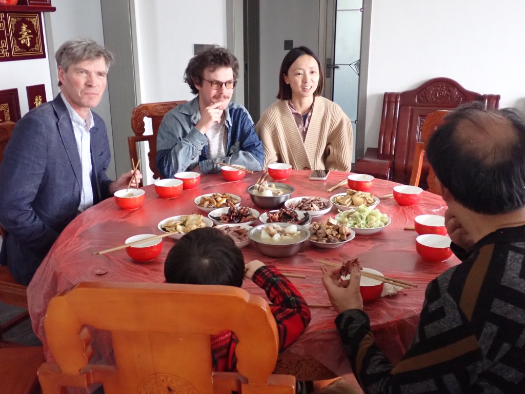 Harry and I had decided to be pragmatic as-near-as-possible vegetarians for the trip, eating around meat when necessary, as it’s almost impossible to avoid it altogether without being really rude, especially when with extended family with whom we don’t share a common language. There were a lot of meat-based dishes in the meal we shared at Ye-Ye’s family home but also delicious smoky cauliflower and beans and mangetout from the vegetable plots around the houses. What surprised us about this meal was that most of the dishes lacked the fieryness we associate with Sichuan food. The same could not be said of the Hot-pot we shared with Casper’s uncles in the restaurant across the road from their house but Kate pointed out that the rich, oily food served in restaurants is not what people eat every day.