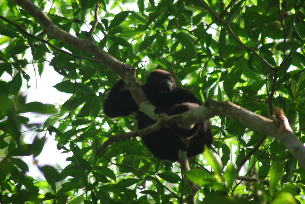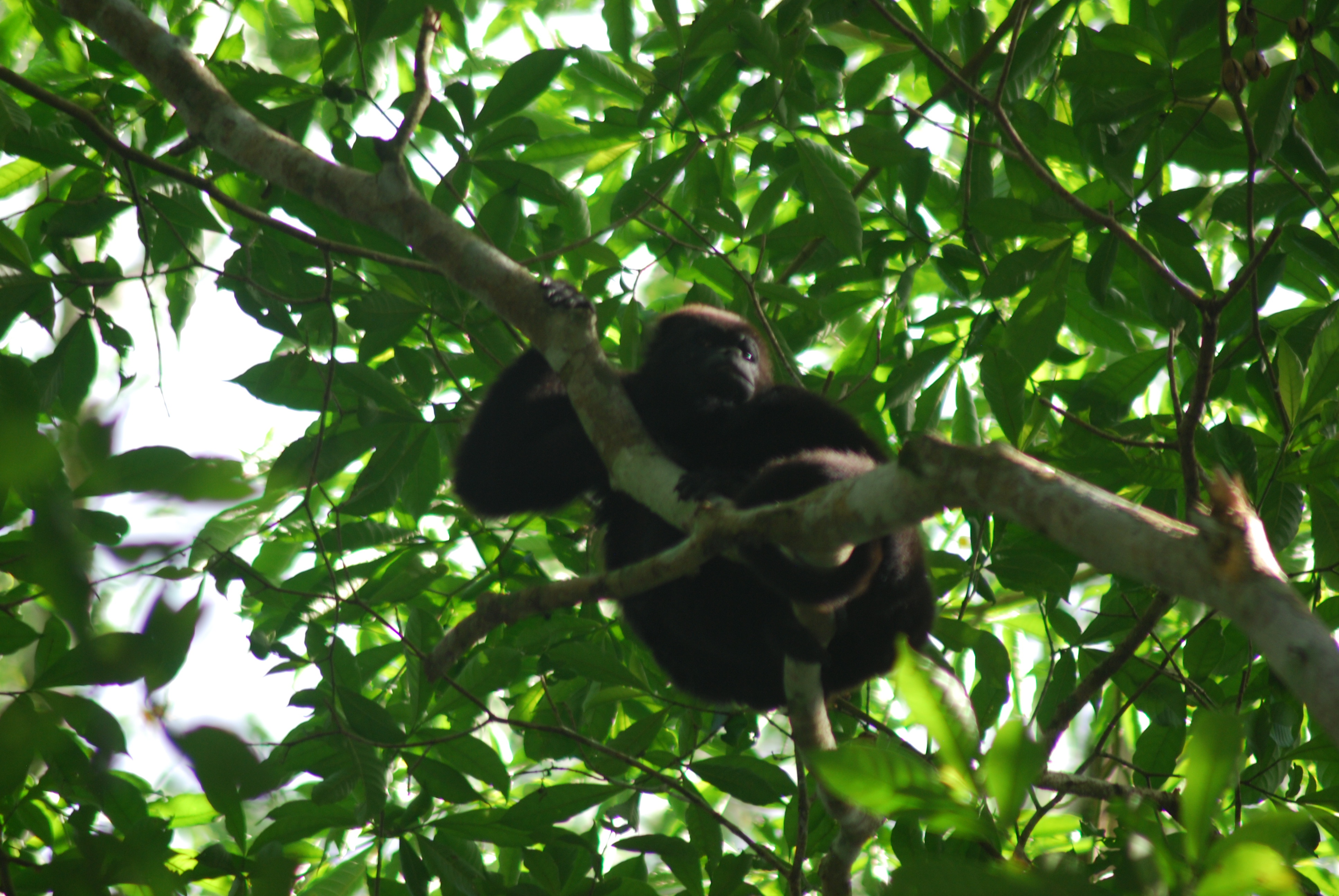 After that it was time for our chance for a close-up look at Howler monkey behaviour. Jane, who runs Las Cuevas, is a primatologist by training with vast knowledge of the monkeys in this area. She’d been following the most local group of Howlers most of yesterday and early this morning and we were lucky enough to get a great view of a group of four – an adult male and female plus their nearly adult daughter and juvenile son. She explained to us how the groups are structured – this is not a family unit as such as the adults are not monogamous and the nearly-mature daughter will soon be forced out of the group and will spend some time on her own before she joins another group as a breeding female. It was amazing to watch the monkeys scrambling effortlessly through the trees, using their tails and opposable toes on the front legs to grip. They were aware of us below them but not much bothered and the young female gave us a great view as she clung upside down to a tree and drank the rainwater collected in a hole – obviously a regular drinking spot for this group. One of the students made an excellent poster with a drawing of this monkey for their evening presentation.