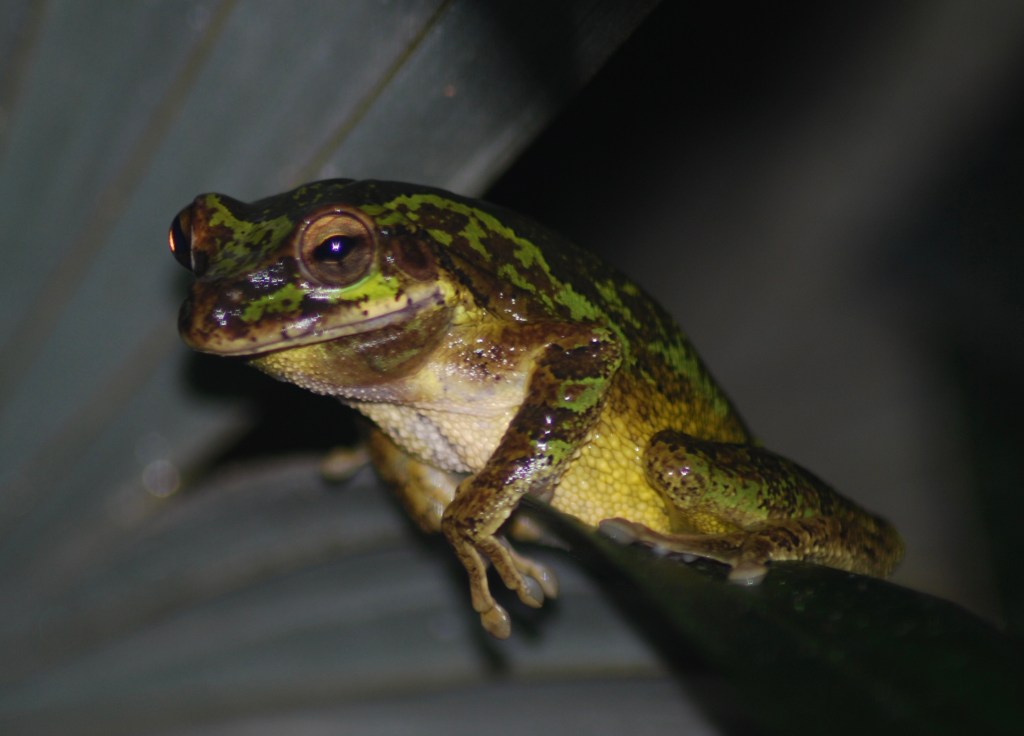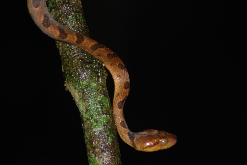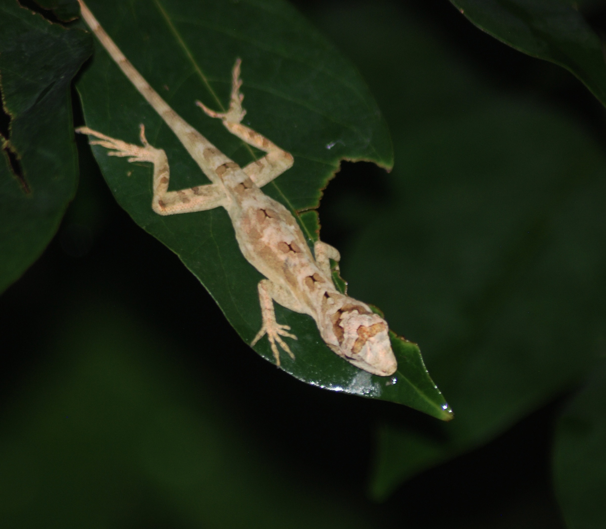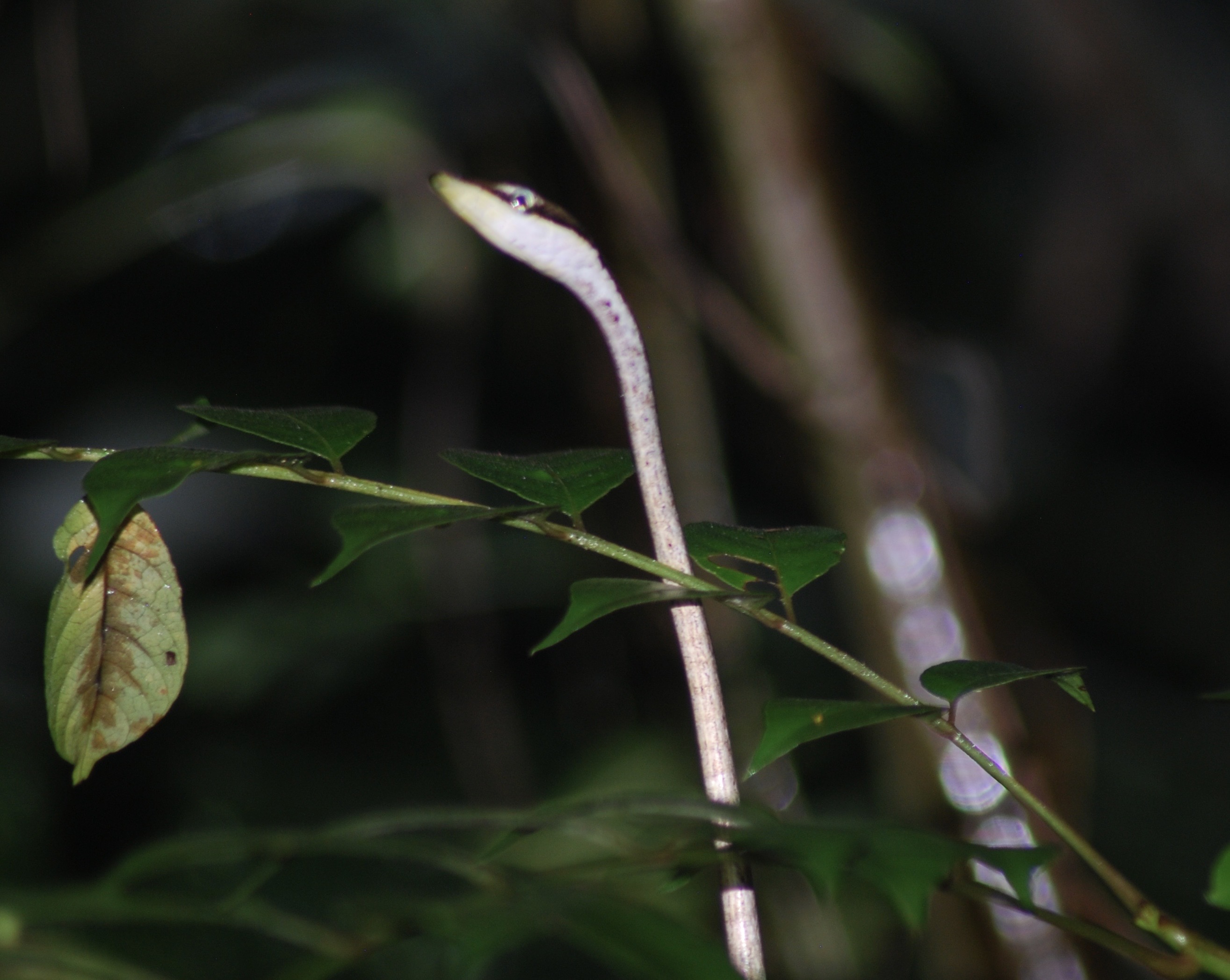 The other cool find of the night was a Brown vine snake, Oxybelis aeneus – a very thin, flat snake with a tiny pointed head which looks just like a dry, white vine winding around other plants. It feeds mainly on lizards, like the Anoles we saw, but also eats frogs and small birds and rodents, apparently. That seems quite a stretch, given that the snake’s head is probably little more than a centimetre in depth! We did once watch a snake swallowing a frog much bigger than its head in Nigeria, and it was quite a sight. Snakes can open their mouths especially wide because their lower jaw bones (mandibles) are not connected directly to each other as in mammals, but are joined by stretchy ligament, allowing them to spread apart sideways and move independently of one another. They are also relatively loosely connected to the back of the skull so can rotate more in situ. The snake is able to slowly walk its mouth forward over the prey item, while its backward pointing teeth hold the animal firmly in place.