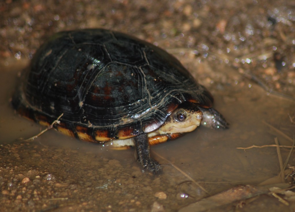 While we were having the lectures there was a very loud bang which we didn’t think much about but when I went to set out the light trap one more time, we found a large tree fallen across the path to the pond and the Maya trail. It was covered in termite tunnels so has presumably been eaten away from the inside out! For fear of missing out, I went on the night walk with Pedro again. This time there were two cat-eye snakes by the pond and very little frogspawn remaining but we saw plenty of frogs, mainly Mexican tree frogs, especially when we walked out along the road, as well as an almost translucent Ghost anole. The heavy rain this afternoon meant lots of mud but also lots of puddles so many of the frogs were on the ground around these. We also spotted a White lipped mud turtle foraging in one of the bigger puddles – they burrow into the mud to escape predators but can also retract their whole bodies inside the shell, not just the head like a tortoise – so are very well protected. Something I didn’t know is that the shells evolved from the rib cage.