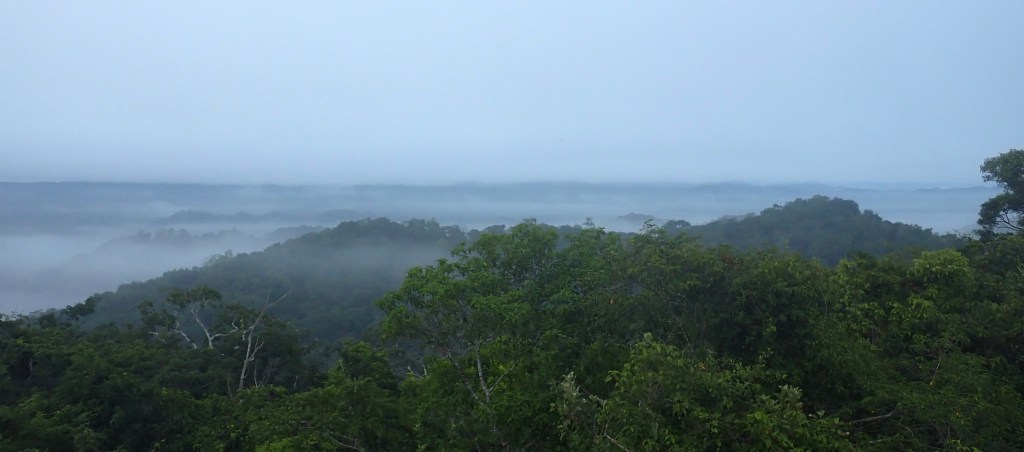 Another excellent day of wildlife spotting. I woke at 4.45 am to hike up to the Bird Tower before breakfast – just Dan, Jonathan, me and one student, which was lovely. I appear to be the jinx as it was misty again, though very beautiful as the mist came and went, revealing forest-covered hills as far as the border with Guatemala. Two groups of Howler monkeys were giving it their all and we rooted for a beautiful Blue Bunting, normally a grain-eater, repeatedly trying to fly up and catch an Orbweaver spider.