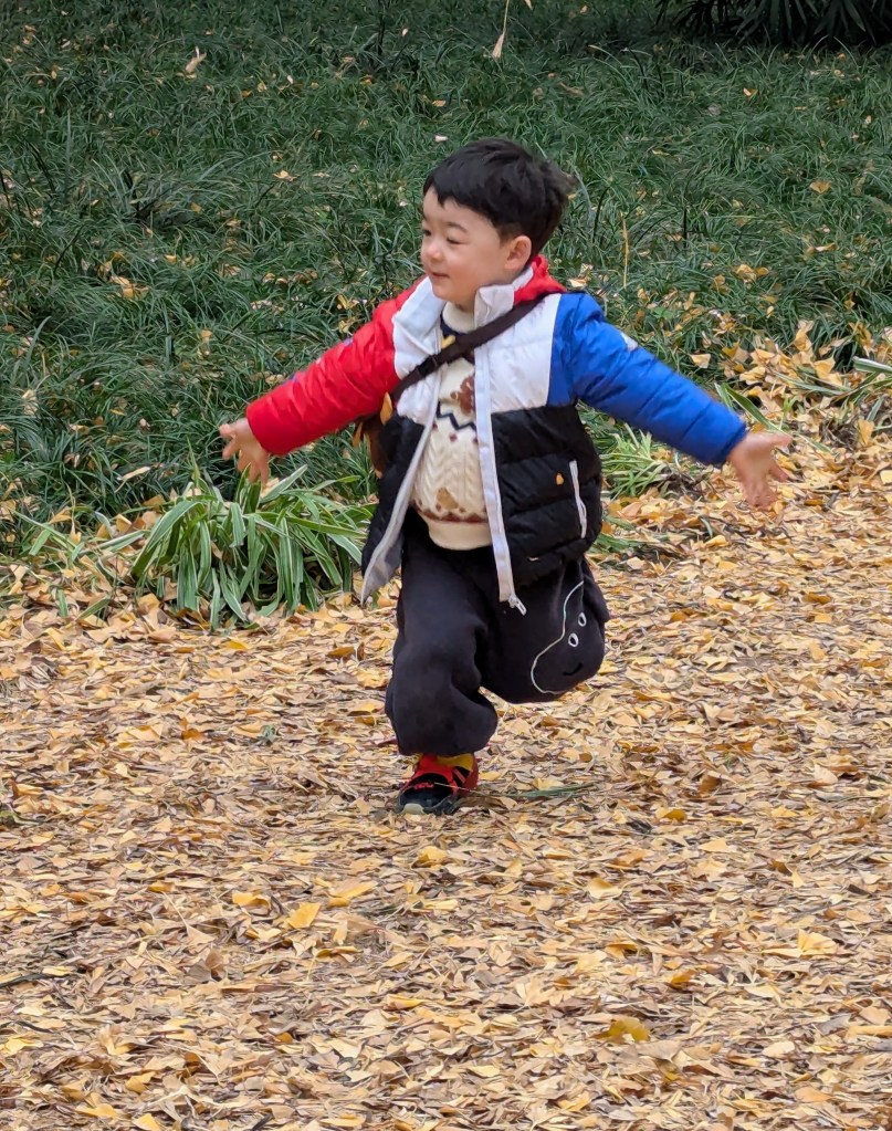 The atmospheric conditions mean that most days at this time of year are unremittingly grey so the rare days when the sky is blue are particularly welcome and I’ve been enjoying the colour of the last Ginkgo leaves of the season. There are noticeably fewer leaves on the trees now than when I arrived a fortnight ago but that has meant piles of golden leaves for Casper and other children to enjoy in the park. Some things are universal!