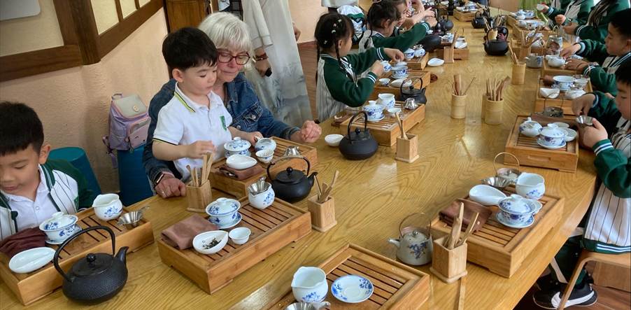 The children were encouraged, first of all, to smell the aroma of the leaves then to carefully warm the lidded cup in which the tea was to be brewed with hot water. Each wooden tea tray has a reservoir beneath, into which waste water is poured, which defintely made the activity more interesting for Casper! The leaves are then added to the brewing cup and this is filled with hot water. Almost immediately the tea is then strained off into a small pitcher, from where it is poured again into tiny, delicate serving cups and the process is repeated. The brevity of the brewing period was a surprise to me and might expain why the green tea we bought on Qingcheng mountain last year tastes a little bitter, the way I’ve been making it. The porcelein on the serving cups is so fine as to be almost translucent. Despite this, and the age of the children, only one was broken! The chlidren were encouraged to pour tiny cups of tea and offer these to their accompanying adults and most of the children also tried the tea – Casper certainly knocked back a few cups.