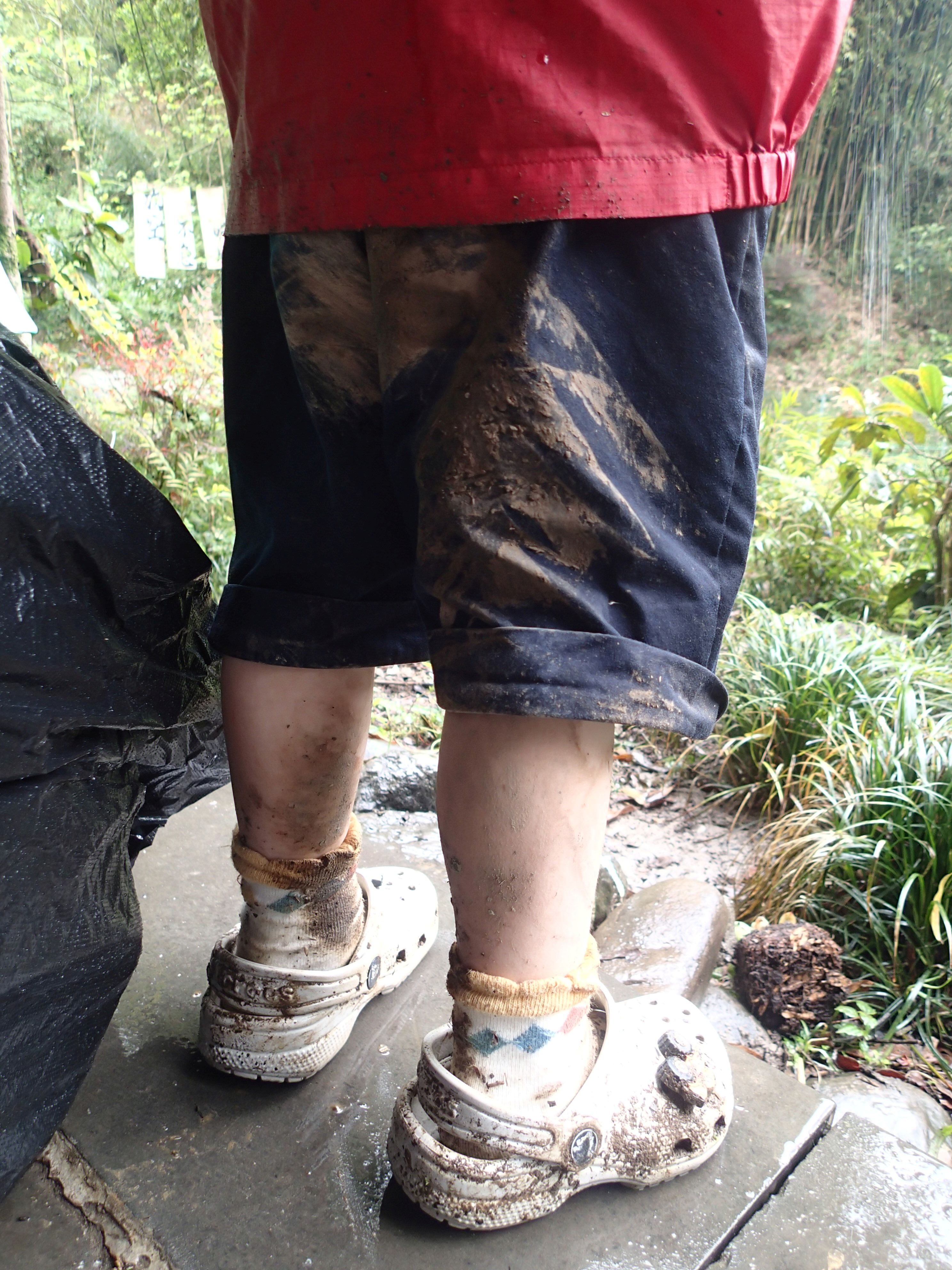 He soon forgot about the kerchief, though, and raced up the steep hill opposite the tea house where tea bushes were growing on narrow terraces. The children were let loose to collect what they could. We’d not understood any instructions, so just went for the youngest few leaves on each shoot and didn’t get told we were doing it wrong, though our grandparenting skills were definitely being questioned – sometimes it’s good not to understand much of what is being said! It started to rain heavily and the red clay soil on which the tea plants were growing soon got very slippery. Having fallen over once, Casper quickly realised that the easiest way to get from one terrace to another was to sit on his bottom and slide. No-one else’s child looked like this….